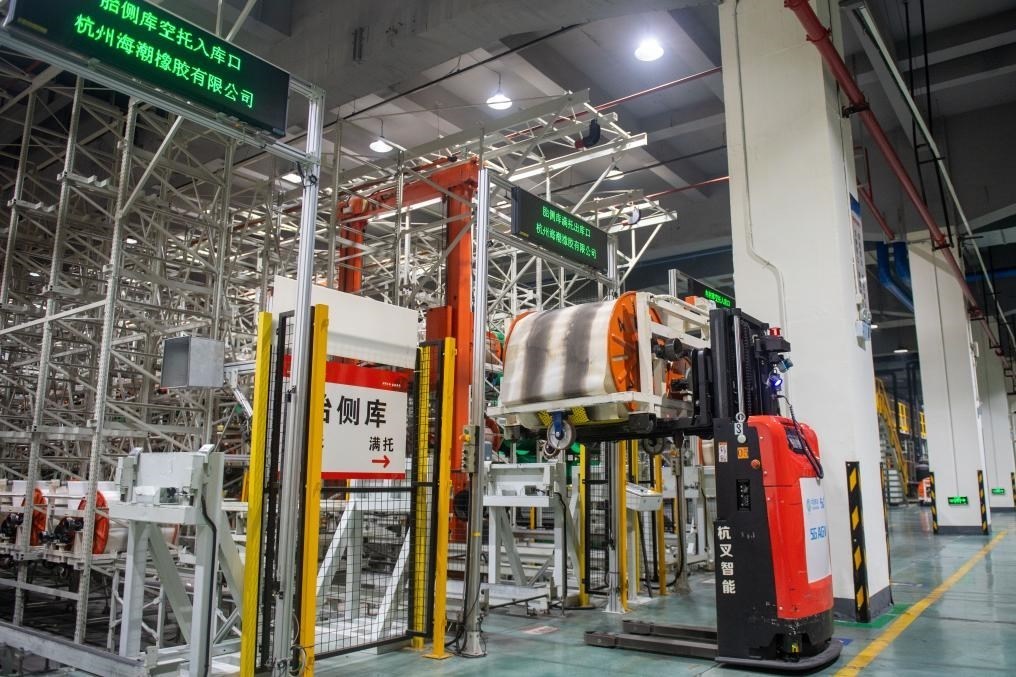 ?在杭州市錢塘區(qū)中策橡膠集團股份有限公司未來工廠內(nèi),無人叉車在運輸產(chǎn)品(2024年2月23日攝)。新華社記者 江漢 攝