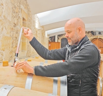 法國(guó)大酒窖集團(tuán)波爾多分公司首席釀酒師和技術(shù)總監(jiān)文森·卡紹在酒窖取酒品嘗。本報(bào)記者 邢 雪攝