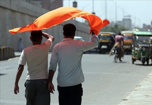 5月27日,在印度北部旁遮普邦阿姆利則地區(qū),兩名男子頭頂一塊布行走以躲避烈日。新華社發(fā)(斯特林格攝)
