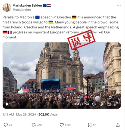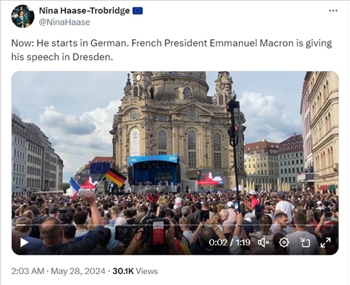 X平臺用戶@NinaHaase在28日凌晨2點(diǎn)03分發(fā)布的推文截圖,稱“現(xiàn)在,法國總統(tǒng)埃馬紐埃爾·馬克龍正在德累斯頓發(fā)表演講,他開場用了德語”,沒有提到法國軍隊(duì)。