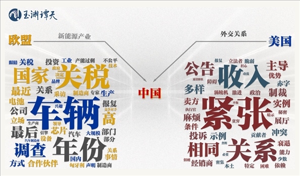 可以看到,以“車輛”“部門”“公司”“制造”等詞為代表的關(guān)鍵詞,都指向了新能源行業(yè)。相比之下,美國(guó)媒體對(duì)同一話題的討論,更側(cè)重“緊張”“關(guān)系”“沖突”“政治”等指向外交關(guān)系的關(guān)鍵詞。