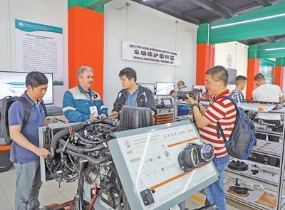 哈薩克斯坦魯班工坊位于東哈薩克斯坦州首府厄斯克門,由天津職業(yè)大學(xué)與東哈薩克斯坦技術(shù)大學(xué)共同承建。圖為在魯班工坊車輛維護(hù)實(shí)訓(xùn)區(qū),聯(lián)合采訪團(tuán)隊(duì)正在對(duì)哈方技術(shù)人員進(jìn)行采訪。本報(bào)記者 趙益普攝