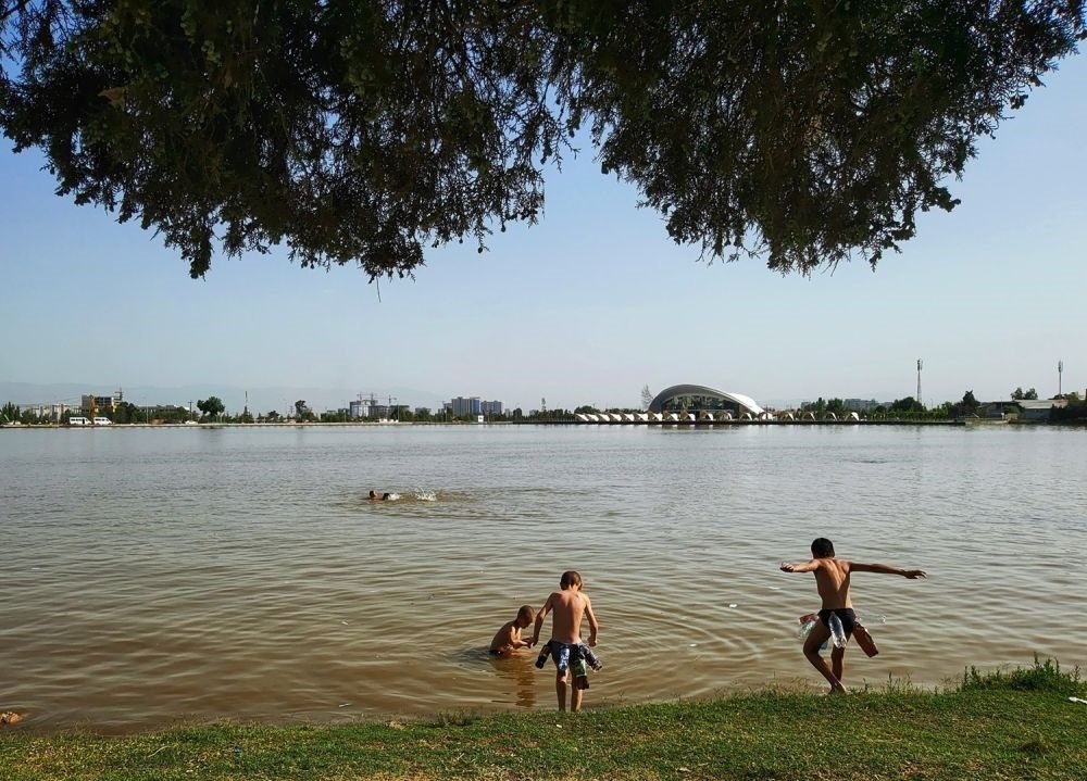 ↑幾名兒童在杜尚別的納烏魯茲宮旁戲水。 新華社記者 燕雁 攝