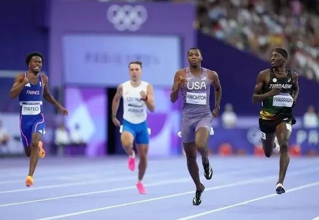 2024年8月5日,美國選手奈頓(右二)在比賽中。當(dāng)日,巴黎奧運(yùn)會田徑男子200米第一輪比賽在法蘭西體育場舉行。新華社記者呂小煒 攝