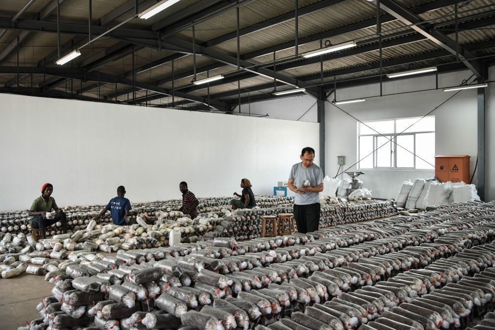 2024年8月13日,在盧旺達(dá)南方省胡耶區(qū)的中國(guó)援盧農(nóng)業(yè)技術(shù)示范中心,菌草專家陳曉斌(右)檢查菌袋。自菌草技術(shù)引入盧旺達(dá)以來,當(dāng)?shù)鼐莓a(chǎn)業(yè)發(fā)展迅速,不僅為市場(chǎng)提供了豐富的食用菌產(chǎn)品,還創(chuàng)造了大量就業(yè)機(jī)會(huì)。