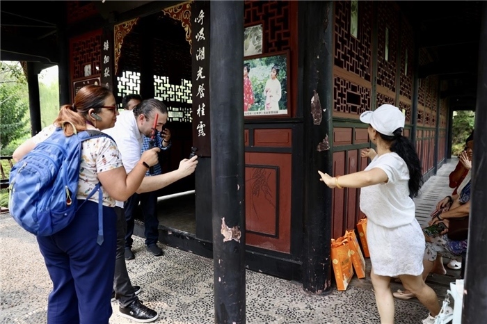 紫藤纏繞,荷葉連綿,位于四川成都新都區(qū)的桂湖公園一片綠意盎然。桂湖公園始建于隋唐時期,是一座自然環(huán)境幽雅、人文底蘊深厚的古典園林。8月30日,2024年“一帶一路”媒體合作論壇拉美媒體采訪團(tuán)來到這里參觀。