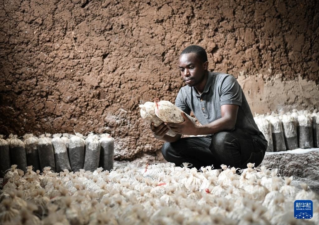 8月14日,在盧旺達南方省穆漢加區(qū),尼揚博·奧貝德在食用菌培育工坊內檢查菌袋。曾兩次赴中國進行菌草技術培訓的尼揚博·奧貝德在南方省和東方省各擁有一家工坊。