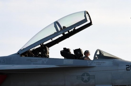 2017年7月22日,在美國弗吉尼亞州諾??撕\娀?,飛行員坐在“福特”號航母上的F/A-18戰(zhàn)斗機中。新華社記者殷博古攝