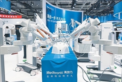 在進博會醫(yī)療器械及醫(yī)藥保健館,美敦力展示的Hugo RAS機器人輔助手術(shù)系統(tǒng)。本報記者 高 喬攝