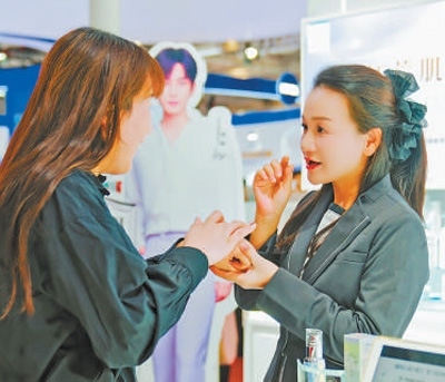 第七屆進博會期間,參觀者在花王展臺體驗相關產品。