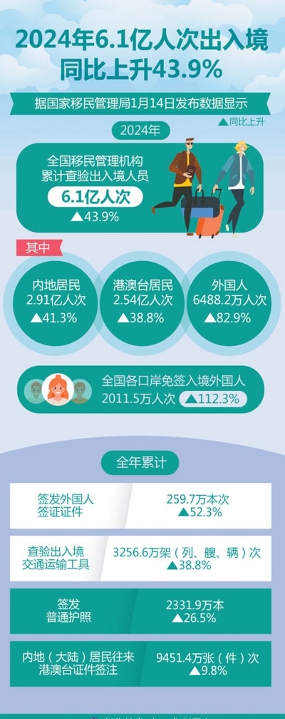 在2024年中國國際傳播年度熱詞榜上,“中國游”一詞名列前十。中國全面放寬優(yōu)化免簽政策,推出一系列便利外國人來華政策舉措,“中國游”成為越來越多外國游客的優(yōu)先選擇。中國國家移民管理局最新數(shù)據(jù)顯示,2024年,全國移民管理機構累計查驗出入境人員6.1億人次,同比上升43.9%;其中內地居民2.91億人次、港澳臺居民2.54億人次、外國人6488.2萬人次,同比分別上升41.3%、38.8%、82.9%。全國各口岸免簽入境外國人2011.5萬人次,同比上升112.3%。說走就走的“中國游”打開了世界了解中國的新窗口、新通道,向全球展現(xiàn)真實、多元和活力滿滿的中國形象。