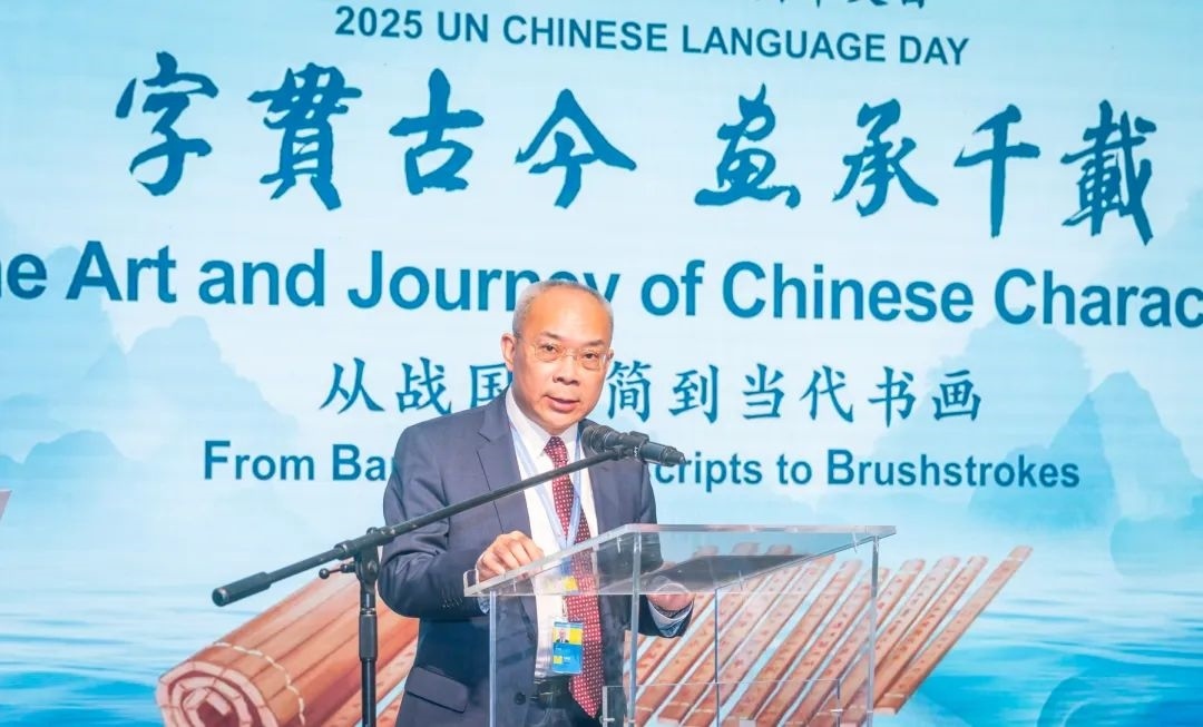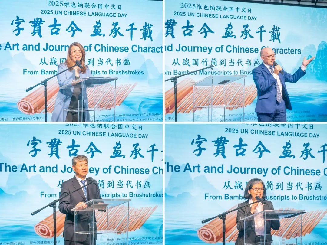 此次中文日活動以“字貫古今 畫承千載——從戰(zhàn)國竹簡到當(dāng)代書畫”為主題,由中國常駐維也納代表團、聯(lián)合國維也納辦事處主辦,中央數(shù)字電視書畫頻道、清華大學(xué)、安徽大學(xué)、吉林大學(xué)協(xié)辦,共同為維也納聯(lián)合國總部獻上了一場中國文化盛宴。清華大學(xué)副校長彭剛、中央數(shù)字電視書畫頻道董事局主席王平在開幕式致辭,探討了文字、文化、文明三者之間的緊密關(guān)系和文明交流互鑒的重要意義。