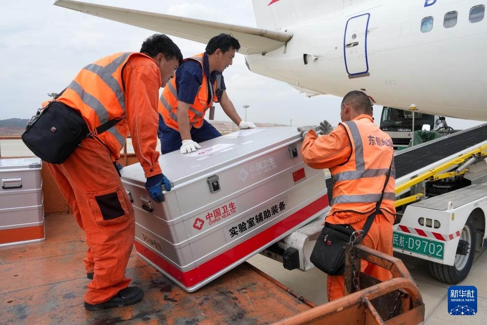 4月19日,工作人員在昆明長水機(jī)場將中國政府援緬衛(wèi)生防疫隊(duì)攜帶的物資裝機(jī)。新華社記者 陳欣波 攝