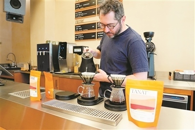 法國(guó)知名精品咖啡烘焙品牌TANAT今年推出兩款產(chǎn)自云南保山紅龍莊園的小??Х犬a(chǎn)品。該品牌首席烘焙師托馬·克萊芒表示,所選的云南咖啡豆口感柔和細(xì)膩,兼具豐富的層次與地域特色。圖為該品牌位于巴黎的一家門(mén)店內(nèi),咖啡師在沖泡云南咖啡。