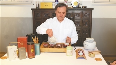 品茶已經(jīng)成為許多意大利人的日常生活習(xí)慣。意大利茶業(yè)與花草茶協(xié)會(huì)主席馬可·貝托納十分喜愛(ài)中國(guó)茶,并收藏有正山小種、普洱茶等多種中國(guó)名茶。圖為馬可·貝托納在展示茶藝。
