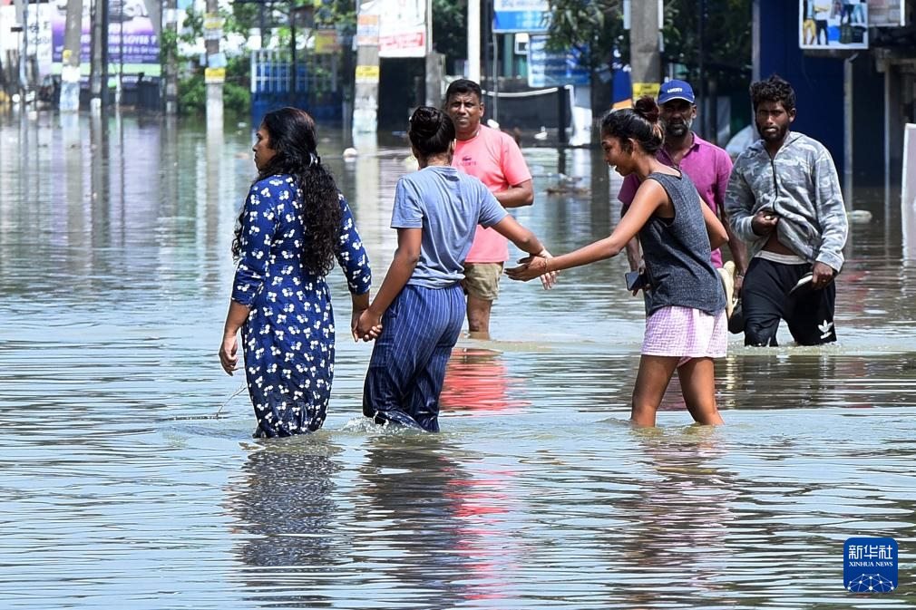 12月1日,在斯里蘭卡首都科倫坡郊區(qū),當地居民涉水出行。新華社發(fā)(加揚·薩米拉攝)