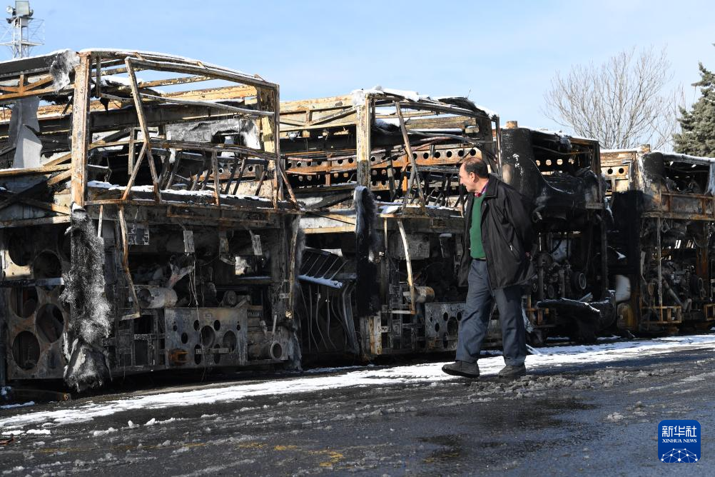 1月21日,在伊朗首都德黑蘭,一名男子走過在近期騷亂中被燒毀的公交車。新華社記者 沙達提 攝
