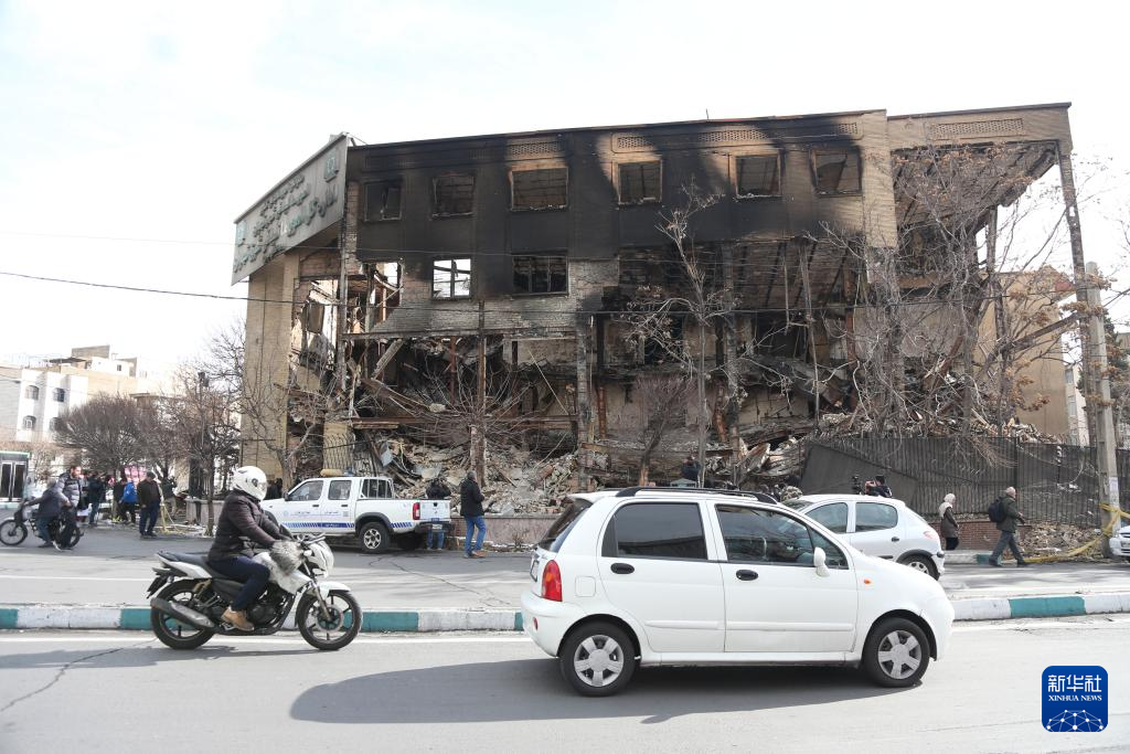 1月21日,在伊朗首都德黑蘭,車輛經(jīng)過在近期騷亂中受損的一處稅務局建筑。新華社記者 沙達提 攝