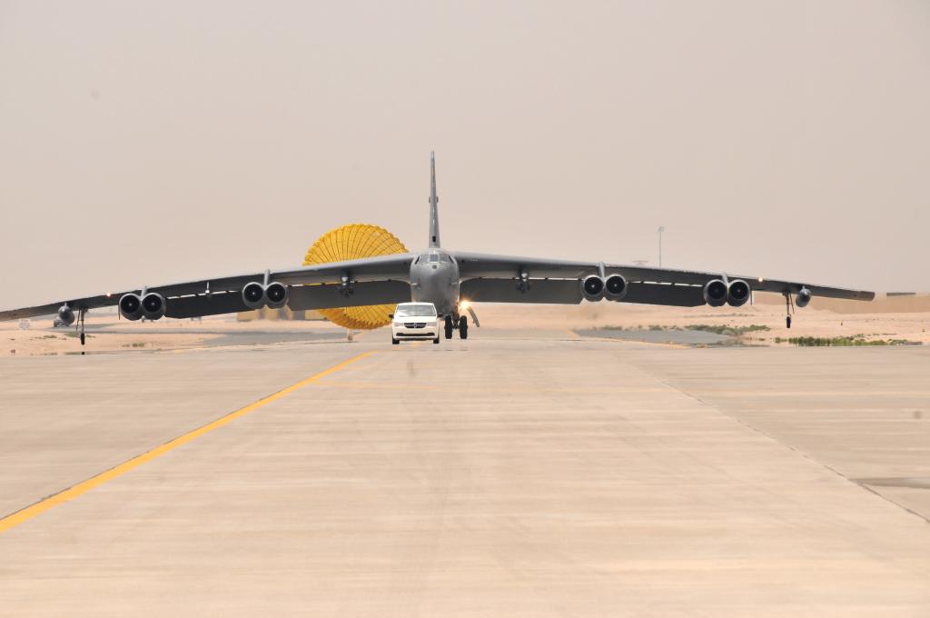 這張資料照片顯示的是2016年4月9日,一架美國空軍的B-52轟炸機抵達(dá)卡塔爾烏代德空軍基地。新華社/美聯(lián)