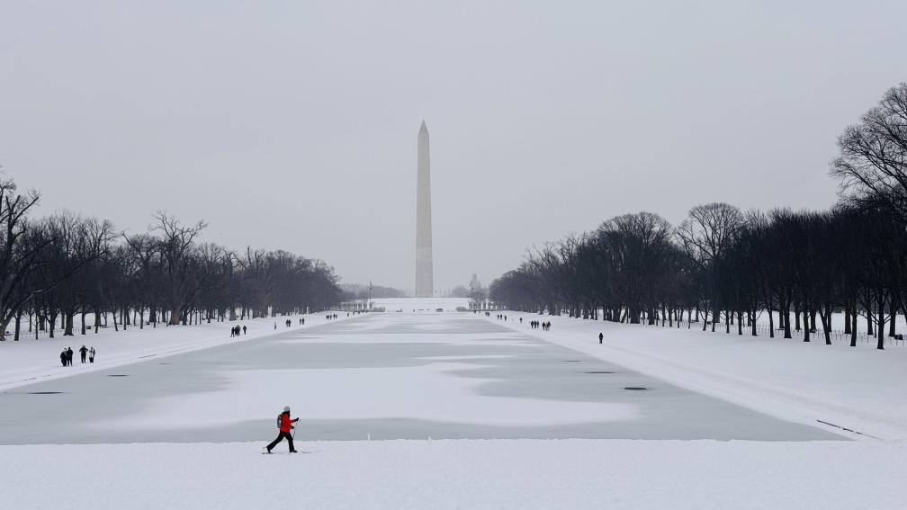 1月25日,人們在美國首都華盛頓林肯紀(jì)念堂倒影池旁的雪中行走。新華社記者徐劍梅攝