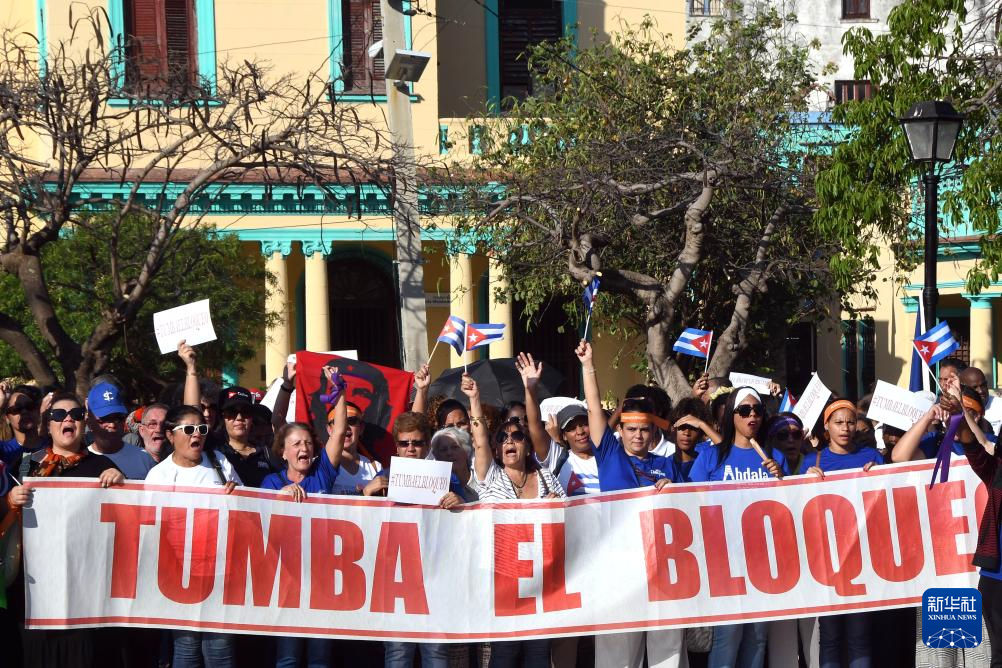4月7日,在古巴首都哈瓦那,婦女們?cè)诩瘯?huì)現(xiàn)場(chǎng)手持“推翻封鎖”的橫幅和古巴國(guó)旗,譴責(zé)美國(guó)對(duì)古封鎖。新華社發(fā)(華金·埃爾南德斯攝)