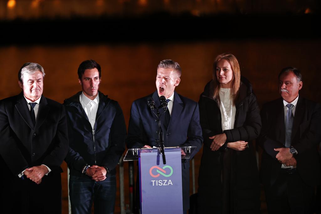4月12日,在匈牙利首都布達(dá)佩斯,匈牙利蒂薩黨領(lǐng)導(dǎo)人毛焦?fàn)枴け说茫ㄖ校┰趧龠x晚會(huì)上講話。新華社發(fā)(鮑洛格·達(dá)維德攝)