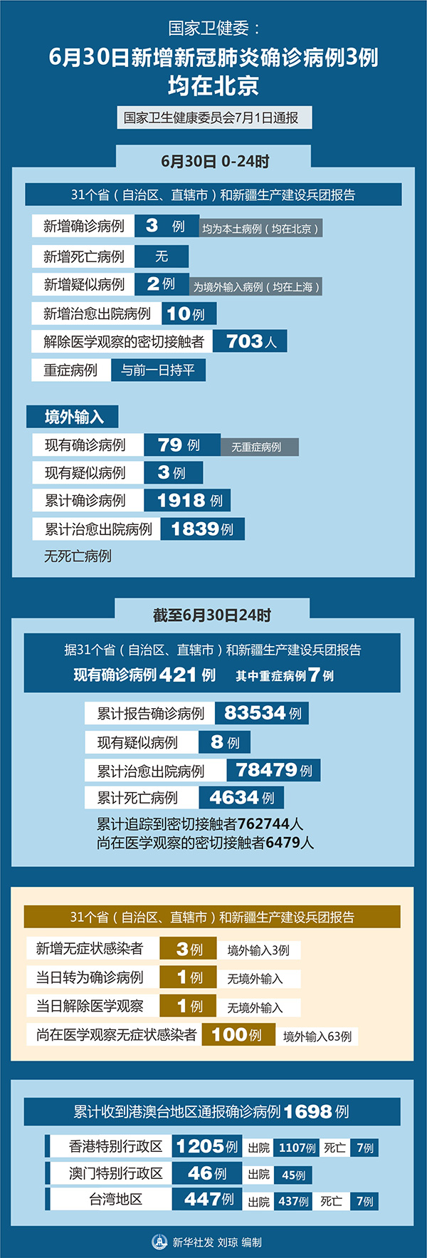 截至6月30日24時,據(jù)31個省(自治區(qū)、直轄市)和新疆生產(chǎn)建設(shè)兵團報告,現(xiàn)有確診病例421例(其中重癥病例7例),累計治愈出院病例78479例,累計死亡病例4634例,累計報告確診病例83534例,現(xiàn)有疑似病例8例。累計追蹤到密切接觸者762744人,尚在醫(yī)學(xué)觀察的密切接觸者6479人。
