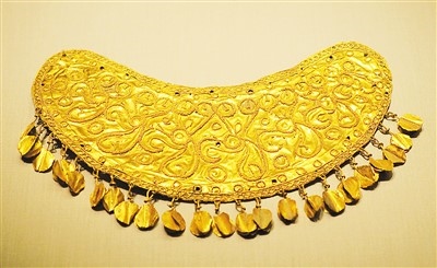 展廳里有不少光彩照人的漢代金飾品,體現(xiàn)了多元文明的融匯。一套出土于鄂爾多斯的金鑲貝玉首飾,由長方形鹿紋金飾牌、方形嵌蚌金串飾、包金玉佩等組成,其中的鹿紋是典型的草原風格紋飾,嵌蚌及其周圍的連珠紋工藝則具有波斯等西方文明的工藝特征。一塊出土于通遼的金飾牌,是薩滿主持祭祀活動時佩戴的飾件,中間雕有一高鼻深目、頭戴尖頂帽的女性,兩側各有一只怪獸,與西伯利亞地區(qū)出土的雙獅守護圣樹金飾牌極為相似。