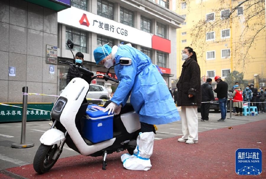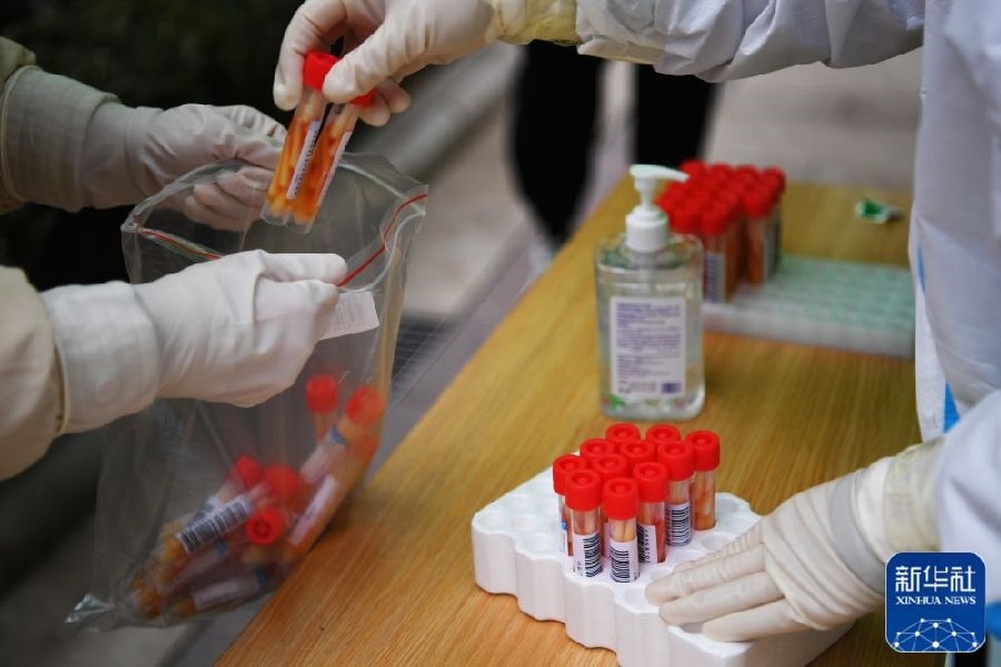 1月10日,在鄭州市高新區(qū)楓楊辦事處譽(yù)園核酸檢測(cè)點(diǎn),志愿者(左)幫助醫(yī)務(wù)人員收集采樣管。新華社記者張浩然攝