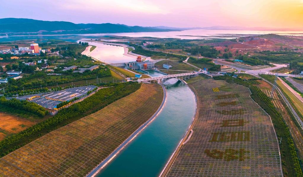 圖為南水北調(diào)中線工程陶岔渠首,上游通過(guò)引水渠與丹江口水庫(kù)相連,下游與南水北調(diào)中線干渠連接。