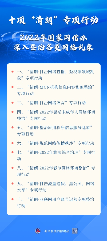 新華社北京3月17日電(記者王思北)記者17日從國新辦舉行的新聞發(fā)布會獲悉,2022年“清朗”系列專項行動將重點開展打擊網(wǎng)絡(luò)謠言,打擊網(wǎng)絡(luò)直播、短視頻領(lǐng)域亂象,算法綜合治理,暑期未成年人網(wǎng)絡(luò)環(huán)境整治等十方面任務(wù)?! ?/p>
