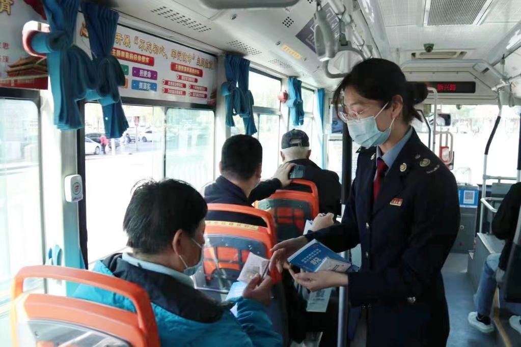 天津市稅務局第一稽查局組織業(yè)務骨干在公交車上進行稅法宣傳。受訪者供圖