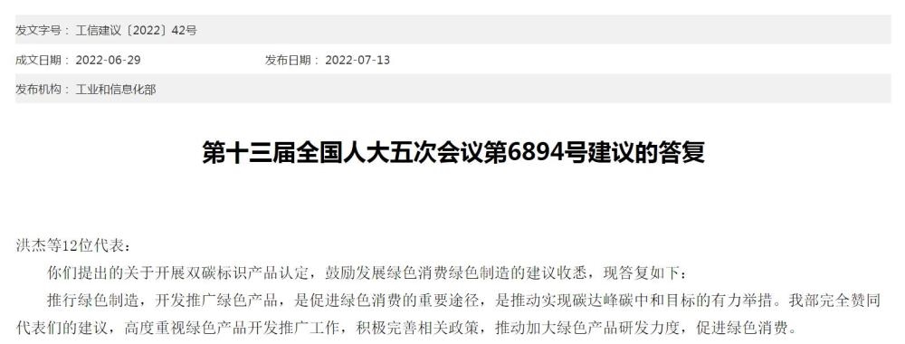 在答復(fù)中,工信部表示,推行綠色制造,開(kāi)發(fā)推廣綠色產(chǎn)品,是促進(jìn)綠色消費(fèi)的重要途徑,是推動(dòng)實(shí)現(xiàn)碳達(dá)峰碳中和目標(biāo)的有力舉措。工信部完全贊同代表們的建議,高度重視綠色產(chǎn)品開(kāi)發(fā)推廣工作,積極完善相關(guān)政策,推動(dòng)加大綠色產(chǎn)品研發(fā)力度,促進(jìn)綠色消費(fèi)。