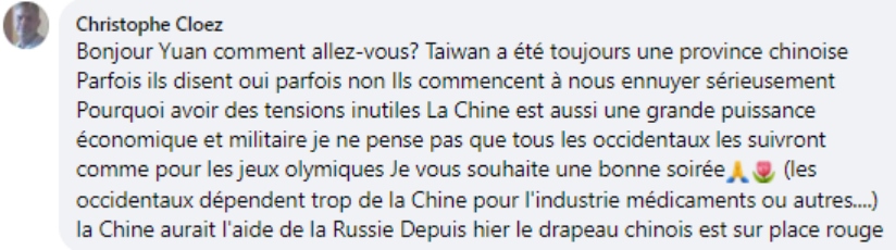 法語網(wǎng)友克羅茲:“臺灣始終是中國的一個(gè)省,美國人一會(huì)兒承認(rèn)一會(huì)兒又不承認(rèn),現(xiàn)在他們又開始搗亂。為什么要制造這種毫無意義的緊張氣氛呢?中國是一個(gè)經(jīng)濟(jì)和軍事大國,我不認(rèn)為西方會(huì)跟著美國走,就像之前的奧運(yùn)會(huì)一樣,西方國家太依賴于中國工業(yè)了。俄羅斯應(yīng)該是支持中國的吧,昨天紅場上方都飄著中國國旗?!?/p>