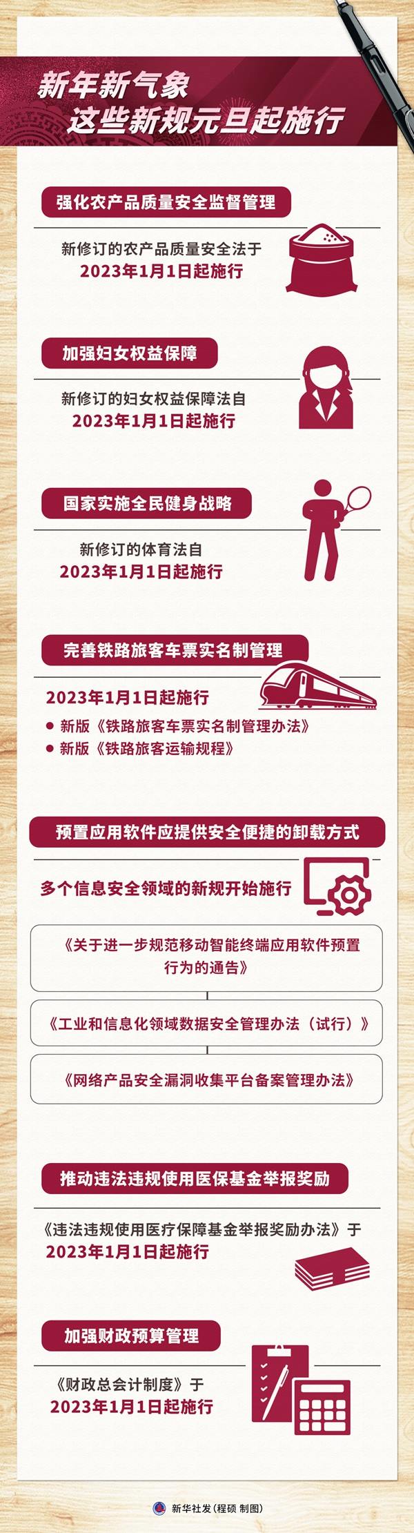 當(dāng)2023年的鐘聲敲響,一批元旦起施行的新規(guī),將為我們帶來新年新氣象。新修訂的農(nóng)產(chǎn)品質(zhì)量安全法全鏈條保障“舌尖上的安全”;新修訂的婦女權(quán)益保障法進一步促進男女平等;新修訂的體育法構(gòu)建全民健身公共服務(wù)體系……法治的溫度,彰顯社會的進步。