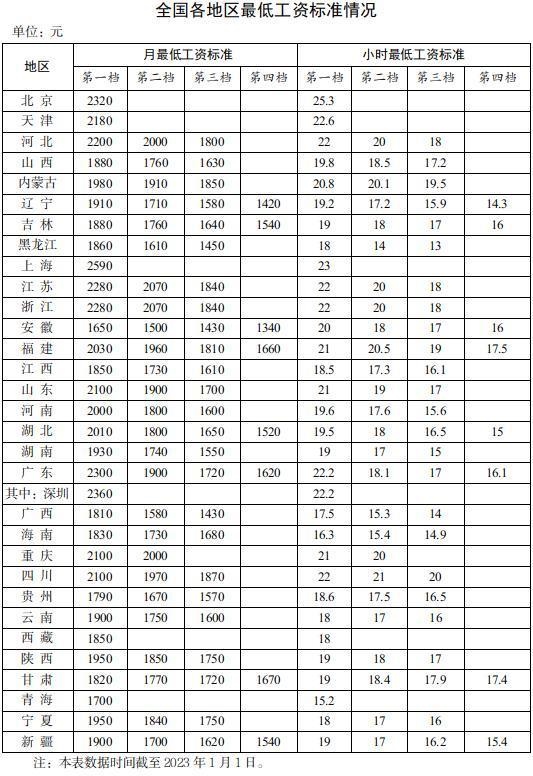 全國(guó)各地區(qū)最低工資標(biāo)準(zhǔn)情況(截至2023年1月1日),來(lái)自人社部網(wǎng)站
