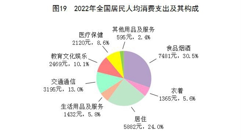 全年全國居民人均消費支出24538元,比上年增長1.8%,扣除價格因素,實際下降0.2%。其中,人均服務性消費支出[54]10590元,比上年下降0.5%,占居民人均消費支出的比重為43.2%。按常住地分,城鎮(zhèn)居民人均消費支出30391元,增長0.3%,扣除價格因素,實際下降1.7%;農村居民人均消費支出16632元,增長4.5%,扣除價格因素,實際增長2.5%。全國居民恩格爾系數為30.5%,其中城鎮(zhèn)為29.5%,農村為33.0%。