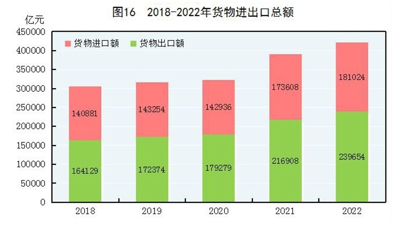 全年貨物進出口總額420678億元,比上年增長7.7%。其中,出口239654億元,增長10.5%;進口181024億元,增長4.3%。貨物進出口順差58630億元,比上年增加15330億元。對“一帶一路”[40]沿線國家進出口總額138339億元,比上年增長19.4%。其中,出口78877億元,增長20.0%;進口59461億元,增長18.7%。對《區(qū)域全面經濟伙伴關系協定》(RCEP)其他成員國[41]進出口額129499億元,比上年增長7.5%。