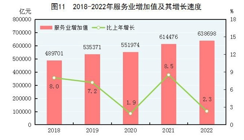全年批發(fā)和零售業(yè)增加值114518億元,比上年增長0.9%;交通運輸、倉儲和郵政業(yè)增加值49674億元,下降0.8%;住宿和餐飲業(yè)增加值17855億元,下降2.3%;金融業(yè)增加值96811億元,增長5.6%;房地產業(yè)增加值73821億元,下降5.1%;信息傳輸、軟件和信息技術服務業(yè)增加值47934億元,增長9.1%;租賃和商務服務業(yè)增加值39153億元,增長3.4%。全年規(guī)模以上服務業(yè)企業(yè)營業(yè)收入比上年增長2.7%,利潤總額增長8.5%。