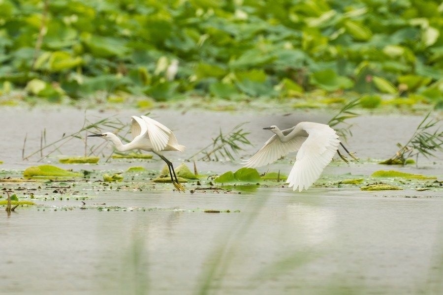 白鷺在白洋淀水面上飛舞(2022年7月10日攝)。