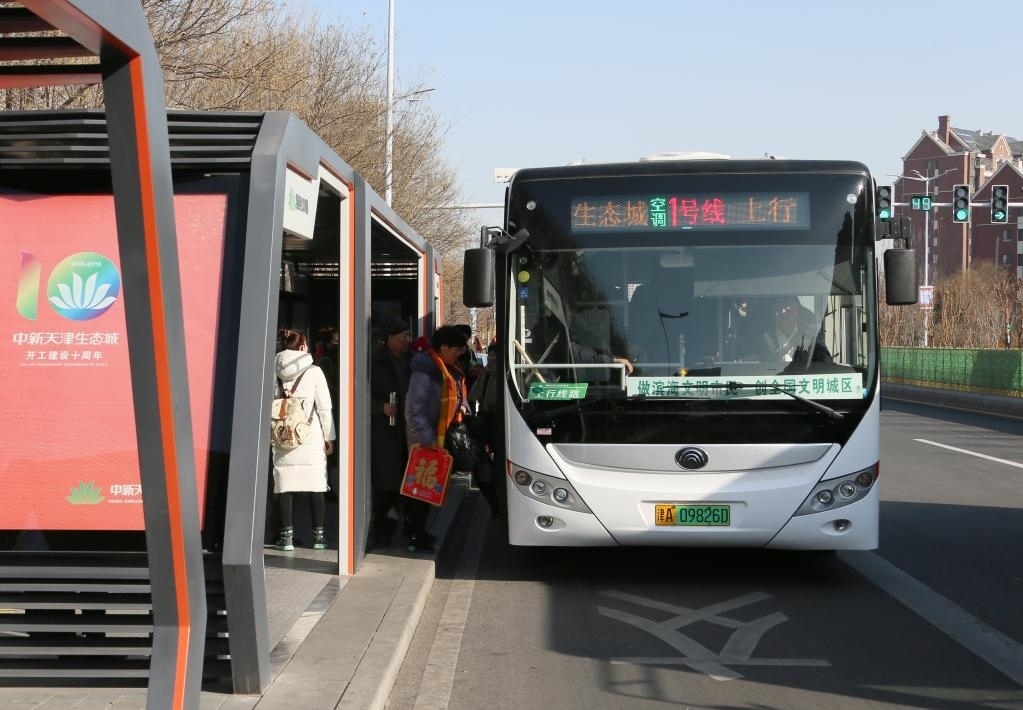 乘客在中新天津生態(tài)城的一座智慧公交站乘坐免費(fèi)的純電動(dòng)公交車。