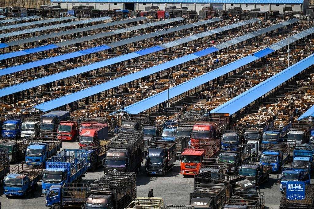 4月12日,內(nèi)蒙古通遼市科爾沁左翼中旗舍伯吐鎮(zhèn)成峰牲畜交易市場(chǎng)里一片繁忙景象,1000余輛貨運(yùn)車(chē)整齊排列,1萬(wàn)余頭黃牛正等待被交易。據(jù)介紹,這個(gè)交易市場(chǎng)年交易80萬(wàn)頭肉牛,交易額可達(dá)80億元。今年以來(lái),當(dāng)?shù)嘏J行星橹饾u轉(zhuǎn)好,來(lái)自遼寧、吉林、山東等地的買(mǎi)家再次聚集于此,帶動(dòng)了養(yǎng)殖戶(hù)增收。新華社記者 連振 攝