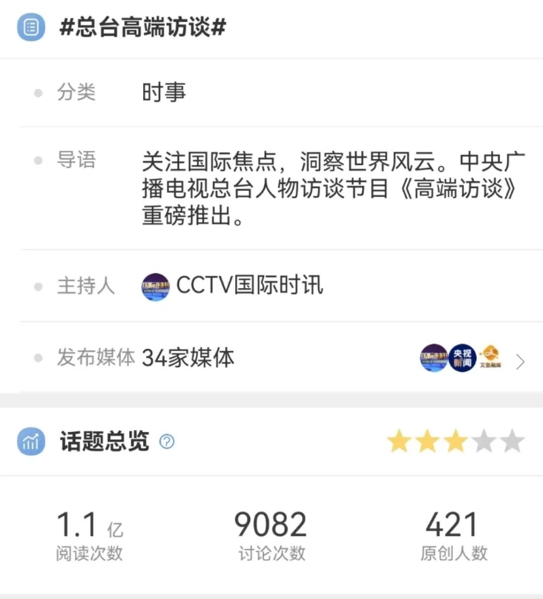 在充分調(diào)研的基礎(chǔ)上,《高端訪談》的采訪敢于碰真問題、硬問題,緊扣當(dāng)下熱點(diǎn),以觀點(diǎn)鮮明、針對性強(qiáng)、易于傳播的重磅采訪報道主動設(shè)置議題,奮力提升中國聲音在國際輿論場中的話語權(quán)。