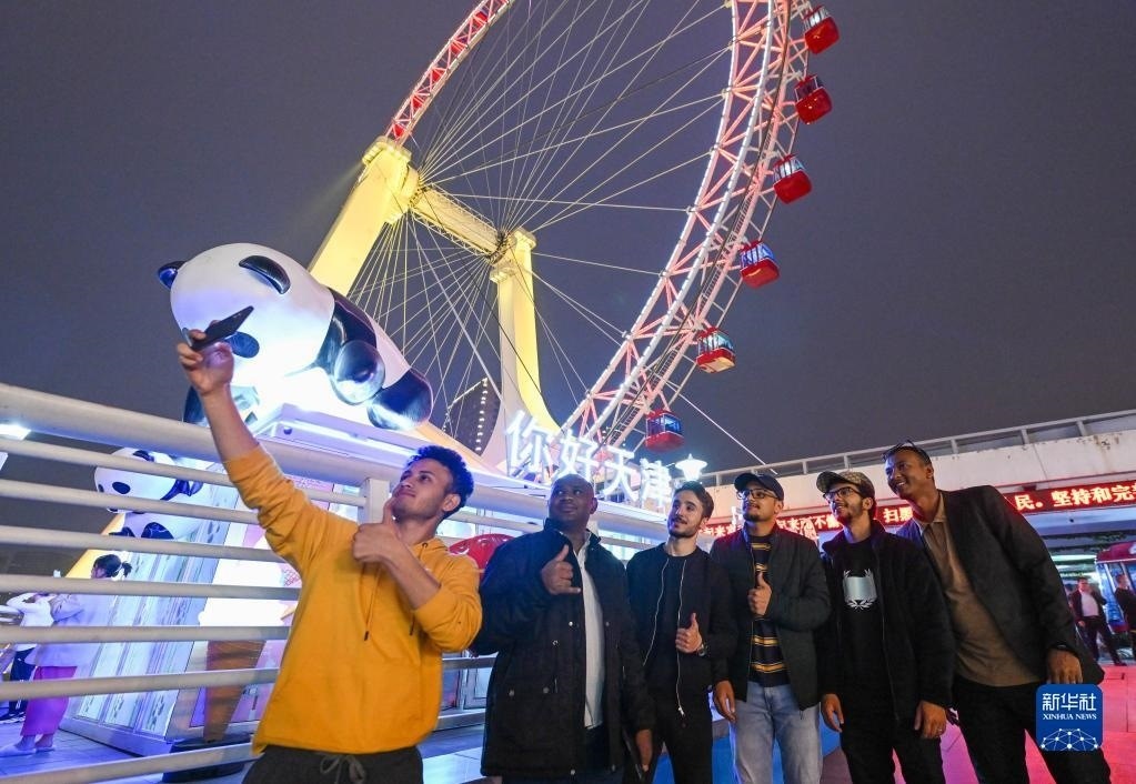 4月27日,北京理工大學的留學生在乘坐“天津之眼”摩天輪前拍照打卡。