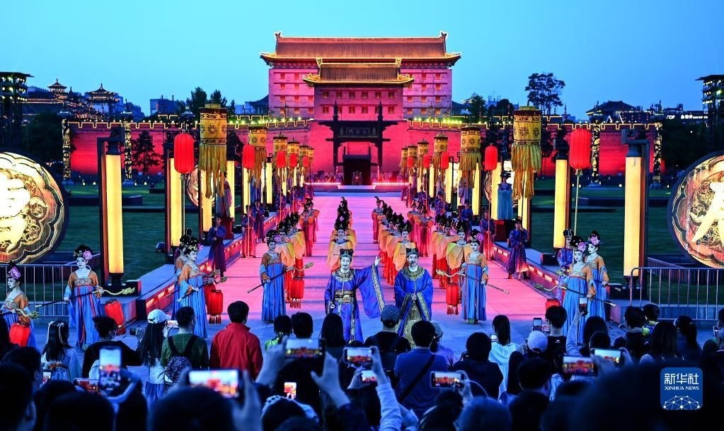 4月30日,游客在西安城墻景區(qū)觀看演出《夢長安——大唐迎賓盛禮》。