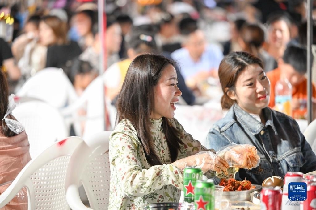 5月2日,游客在江蘇省淮安市金湖縣龍蝦廣場品嘗金湖小龍蝦。