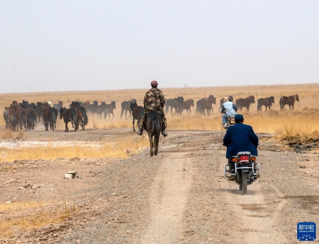 5月3日,在阿克塞縣阿伊納鄉(xiāng)海子草原,牧民趕著馬群進(jìn)行轉(zhuǎn)場。   新華社發(fā)(高宏善 攝)