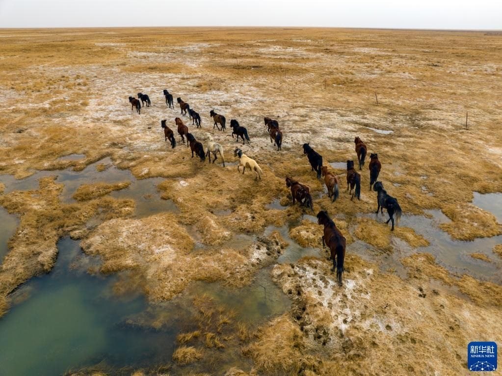 5月3日,在阿克塞縣阿伊納鄉(xiāng)海子草原,牧民趕著馬群進(jìn)行轉(zhuǎn)場(無人機(jī)照片)。