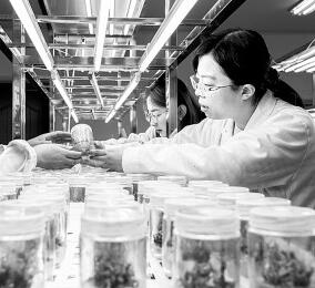 3月29日,在內蒙古林業(yè)科學研究院承擔的“沙地生物資源保護與培育國家林業(yè)和草原局重點實驗室”,科研人員在觀察黑果枸杞組培苗的培養(yǎng)狀態(tài)。丁根厚攝/光明圖片