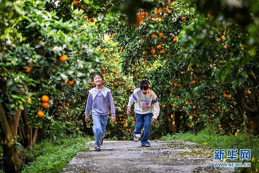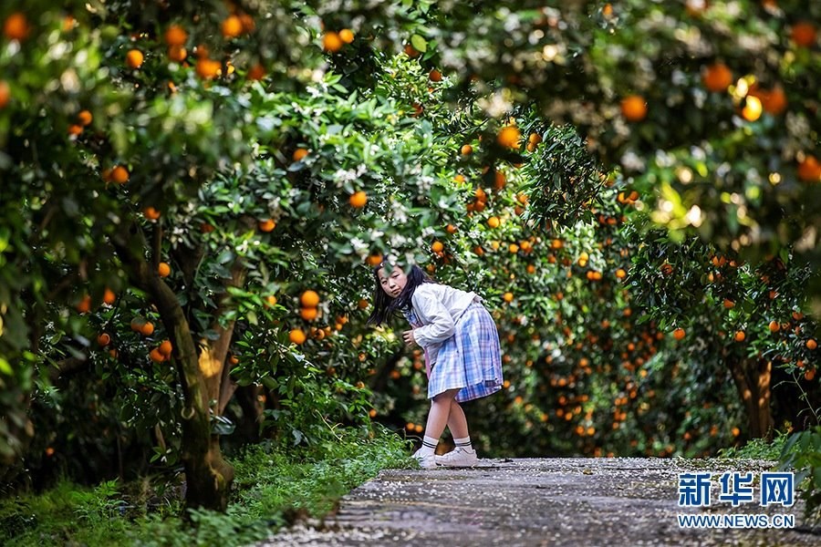 每到橘花燦爛時,綠浪掩映金色橙果,微風(fēng)輕送撲鼻花香,吸引了不少游客前來觀賞,果子也實現(xiàn)就地銷售,柑橘成為農(nóng)民增收的“搖錢樹”。新華網(wǎng)發(fā)(余鴻 攝)